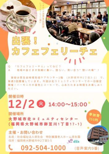 地域包括ケアセンターでほぼ毎日開催をしている「カフェフェリーチェ」 地域の皆様にご協力いただき、だれでも気軽に集い、語らい、笑いあう憩いの場! 毎日満員、大好評の地域カフェですが、この度、大野城市北コミュニティセンター様に出張をすることとなりました。 この機会にぜひ、ご参加をお待ちしております。 ■日時 2025年12月2日(火) 14:00 ■場所 大野城市北コミュニティセンター 福岡県大野城市御笠川1-17-1(駐車場有り) ■費用 200円